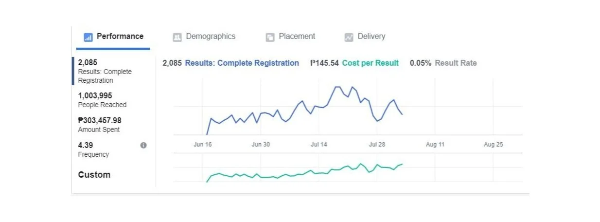 We launched an advertising campaign for a yearly event targeted to a niche market. In this campaign, we highly utilized the database that we were able to build over the years through quality posts and advertising. Forecasting and adjustments were easy since we knew how much each lead costs. In this case, it is an average of P145.00 per registration